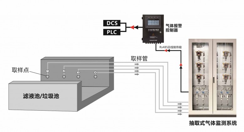 目前針對(duì)垃圾發(fā)電廠有毒氣體在線監(jiān)測(cè)方面的改進(jìn)方案是采用多點(diǎn)抽取式,將每個(gè)監(jiān)測(cè)區(qū)域分幾個(gè)采樣點(diǎn),將檢測(cè)儀表統(tǒng)一安裝于一個(gè)機(jī)柜里,安放在安全區(qū)域,每個(gè)采樣點(diǎn)到每臺(tái)檢測(cè)儀表各鋪設(shè)一根采樣管,通過(guò)間歇循環(huán)抽取實(shí)現(xiàn)多區(qū)域采樣,實(shí)現(xiàn)危險(xiǎn)氣體在線監(jiān)測(cè),監(jiān)測(cè)數(shù)據(jù)通過(guò)有線或無(wú)線形式傳輸至氣體報(bào)警控制器或監(jiān)控中心的PLC或DCS系統(tǒng),該方案具有自動(dòng)抽取控制、氣體超限聲光報(bào)警、預(yù)處理系統(tǒng)等功能,后期維護(hù)校準(zhǔn)都很簡(jiǎn)單,更能有效保障工作人員人身安全。