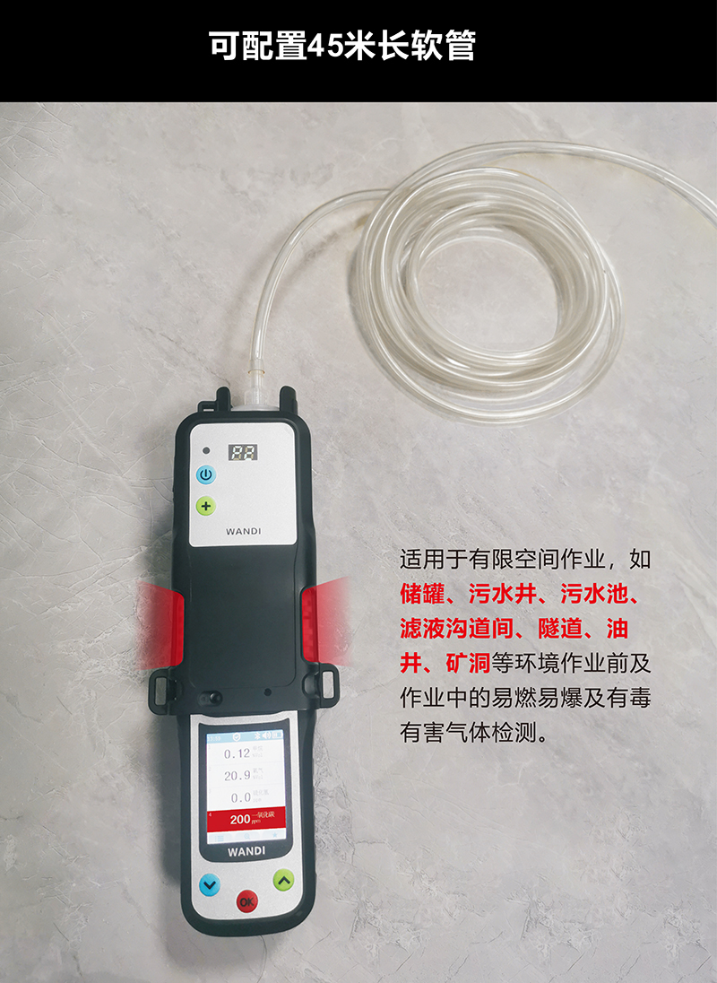 選擇EDW500便攜式氣體探測器,適用于個人安全防護、巡檢作業(yè)、區(qū)域監(jiān)測、有限空間作業(yè)以及在油井、礦洞、通道或罐體內(nèi)的有毒有害氣體和可燃氣體實時濃度的安全測量。 可同時測量多達5種氣體。為確保氣體探測器能夠準確讀取有限空間內(nèi)的氣體濃度,作業(yè)前必須配備外置泵適配器,進氣口可連接軟管(可根據(jù)現(xiàn)場需要確定軟管長度,最長可達45米),借助外置泵適配器,就可以輕松的從擴散模式切換到泵吸模式,主動抽取有限空間內(nèi)的有毒有害和可燃氣體,第一時間了解到各氣體的濃度情況,以便采取更好的安全措施。